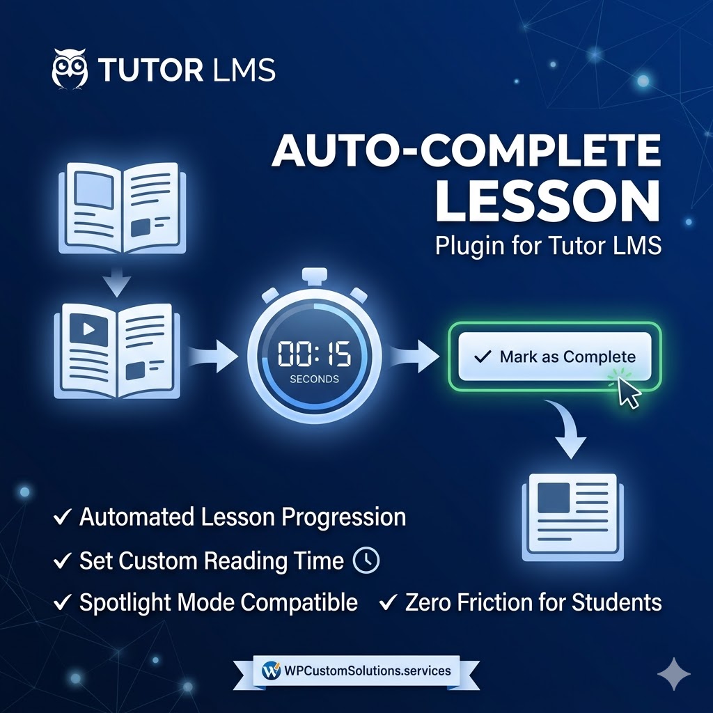 The Tutor LMS Auto-Complete Lesson Plugin is a lightweight, plug-and-play solution that automatically triggers lesson completion and navigates the student to the next topic after a customized time delay.