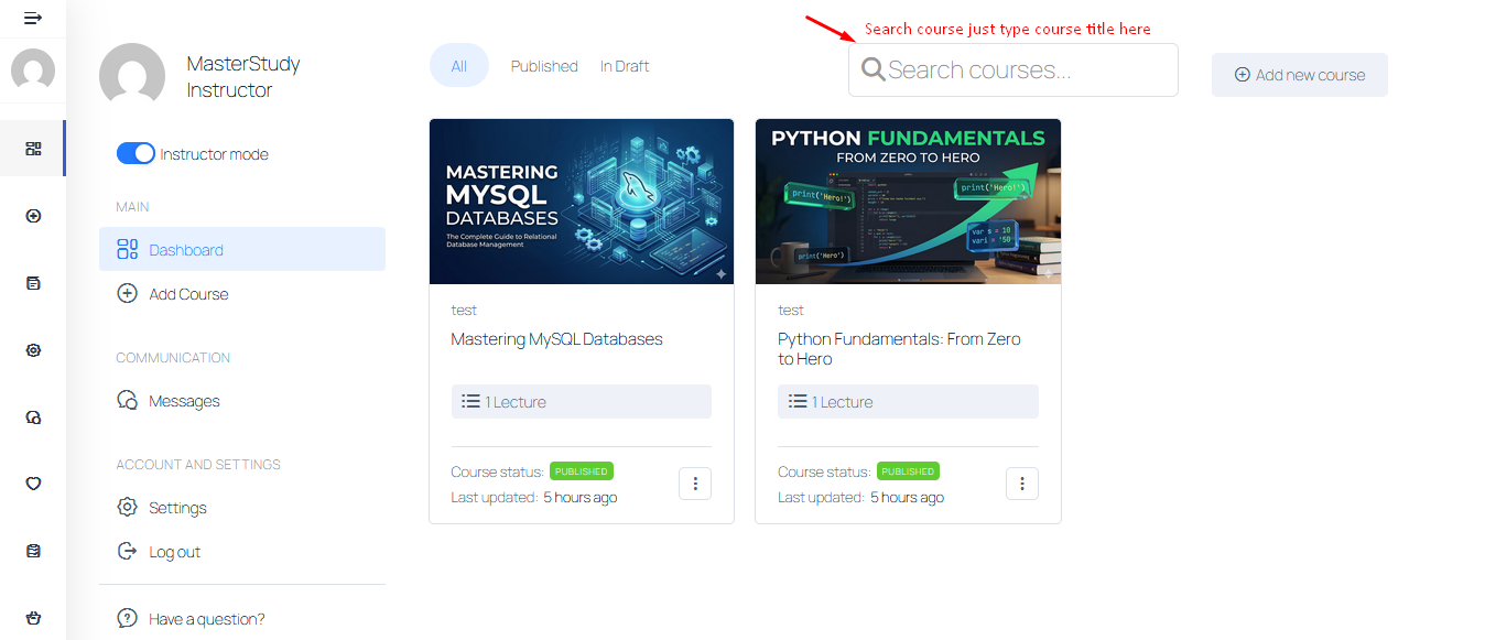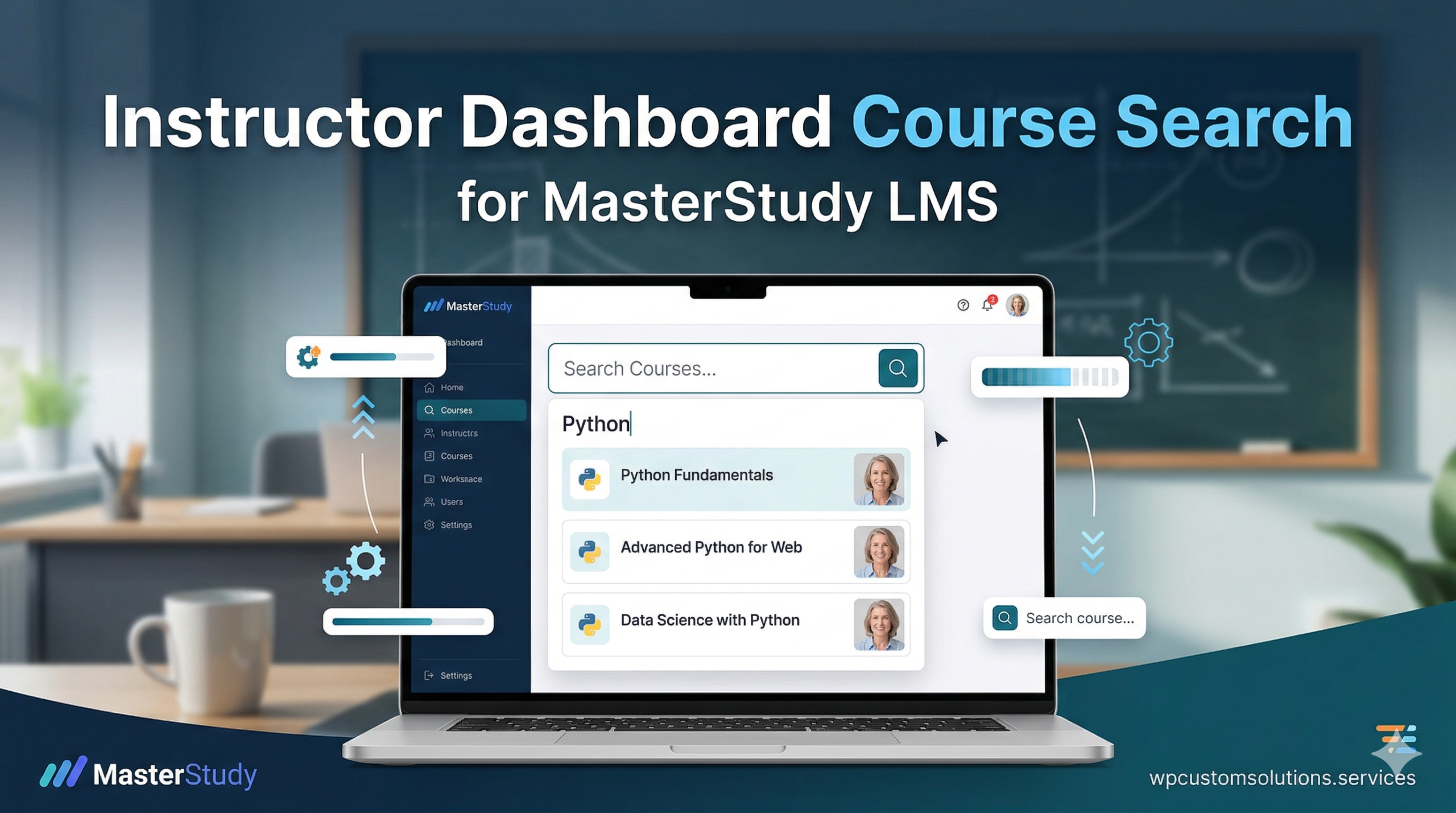 Instructor Course Search Adds a powerful, AJAX-powered search bar to the MasterStudy Instructor Dashboard. Enables teachers to search their entire course library by title from the frontend, bypassing the standard backend loading times.