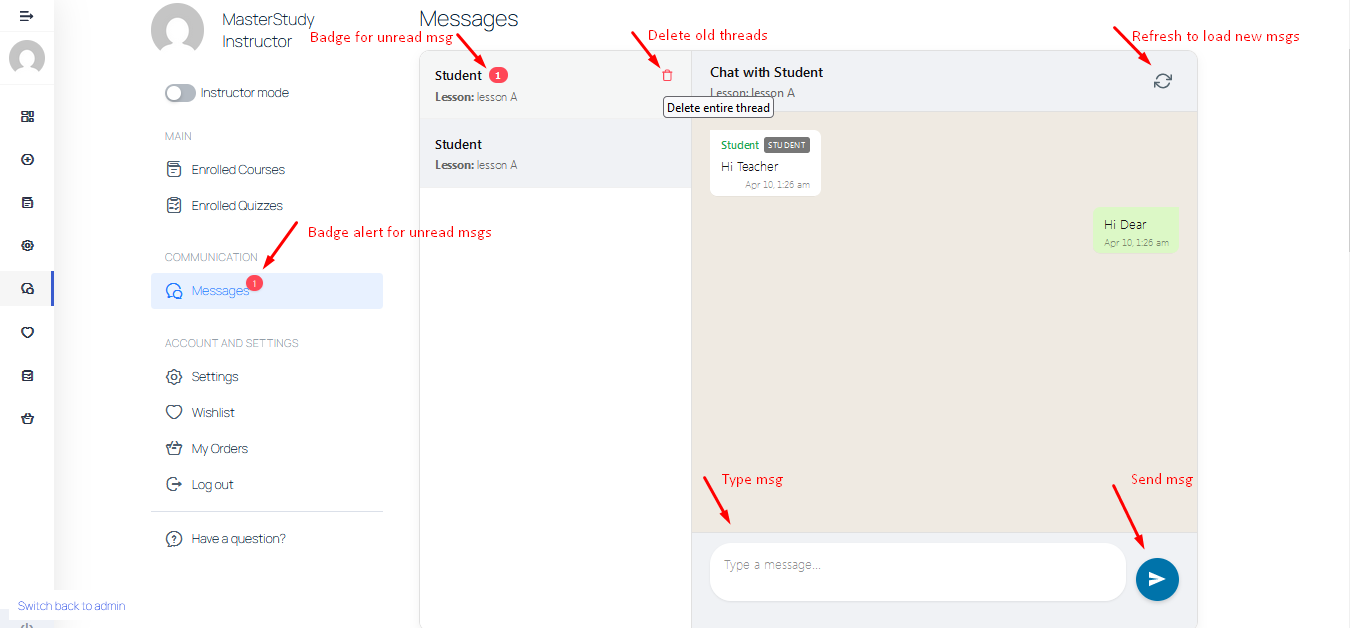 • Message & Thread Deletion: Users can delete their own individual messages. Instructors have advanced privileges to clear out and delete entire old conversation threads to keep their dashboard organized.