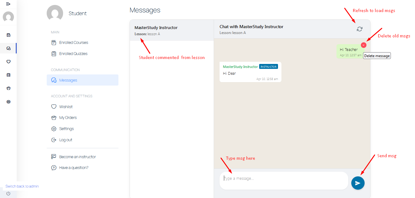 Upgrade Your MasterStudy LMS Communication Say goodbye to the standard, clunky WordPress comment section. The Advanced Student-Teacher Advanced Chat Dashboard  replaces the default MasterStudy discussion area with a sleek, split-screen messaging application. Designed for maximum engagement, it gives instructors and students a real-time, intuitive way to communicate directly within your e-learning platform.