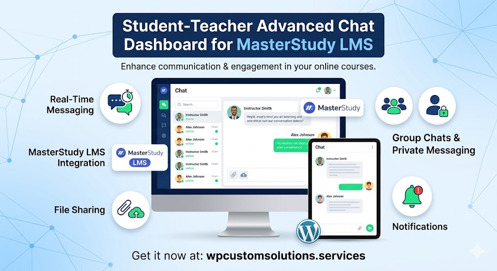 Transform student-teacher communication with a modern, chat interface for MasterStudy LMS. Features real-time AJAX messaging, global unread badges, message deletion, and fully customizable email notifications. Works seamlessly across Lessons, Quizzes, Assignments, and Course pages.